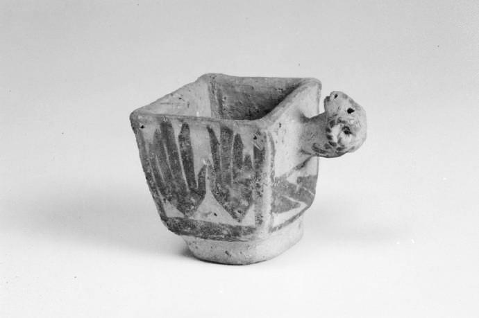 另一件人形三角折帶紋雙足罐,單耳,夾沙紅陶質(zhì)地,高約11厘米,圓鼓的肚子,身著黑色帶狀紋、豎條紋和“Z”字形紋的華麗衣衫,足穿一雙平底大鞋,鞋頭尖而深,似乎是一個孕婦形象。這可能是3700年前女性著裝的樣式。
