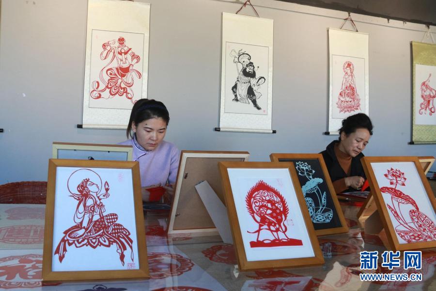 在甘肅敦煌小鎮(zhèn)鳴沙書院,“敦煌剪紙”酒泉市級非物質(zhì)文化遺產(chǎn)代表性傳承人莊生娟(左)在自己的工作室內(nèi)指導學員剪紙(2020年12月31日攝)。新華社發(fā)(張曉亮 攝)