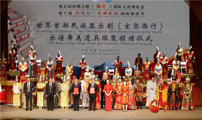 演出結(jié)束后,現(xiàn)場舉行了簡潔而隆重的“大型民族器樂劇《玄奘西行》樂譜舞美道具服裝捐贈儀式”,中央民族樂團(tuán)將價(jià)值360萬元的樂譜、舞美、道具和服裝捐贈給甘肅演藝集團(tuán)歌舞劇院,并指導(dǎo)甘肅省文藝院團(tuán)將民族器樂劇《玄奘西行》打造成為弘揚(yáng)絲路精神、推動絲路文化交流融合的經(jīng)典劇目。中央民族樂團(tuán)作為海內(nèi)外規(guī)模最大、藝術(shù)最完備的綜合性國家級民族音樂表演團(tuán)體,對甘肅文藝事業(yè)和地方樂團(tuán)創(chuàng)作發(fā)展和人才培養(yǎng)給予大力支持,為甘肅文藝事業(yè)發(fā)展做出了重大貢獻(xiàn)。