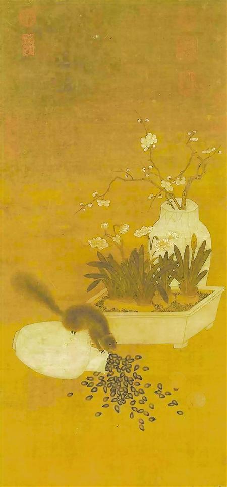 元代的《歲朝圖》中在瓶梅和水仙盆景前,描繪了一只偷堅(jiān)果的小松鼠,貯果的瓷瓶被打翻,瓜子灑了一地,旁邊還有兩顆打滾的核桃。