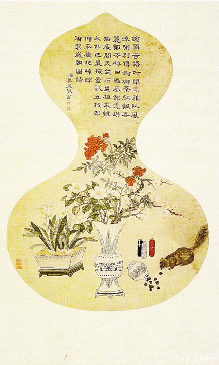 華麗的青花美人觚插滿梅茶天竹三件套,占據(jù)畫面的主體,右下方可見一只偷吃瓜子的小松鼠,后面還立著三支爆竹。上方題詩“匹鼠探壺試五技,卻傾瓜種兆綿綿。”