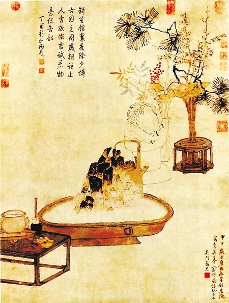 類似的畫作還有明代吳門畫派張宏的作品。畫面中心的榾柮爐中溫著一壺酒。后側(cè)果盤中盛放佛手,插花的器物則是枯瘦的青銅花觚和清麗的白瓷瓶,所插之物相應(yīng)地配以墨線勾勒的梅柏和淡雅設(shè)色的天竹。