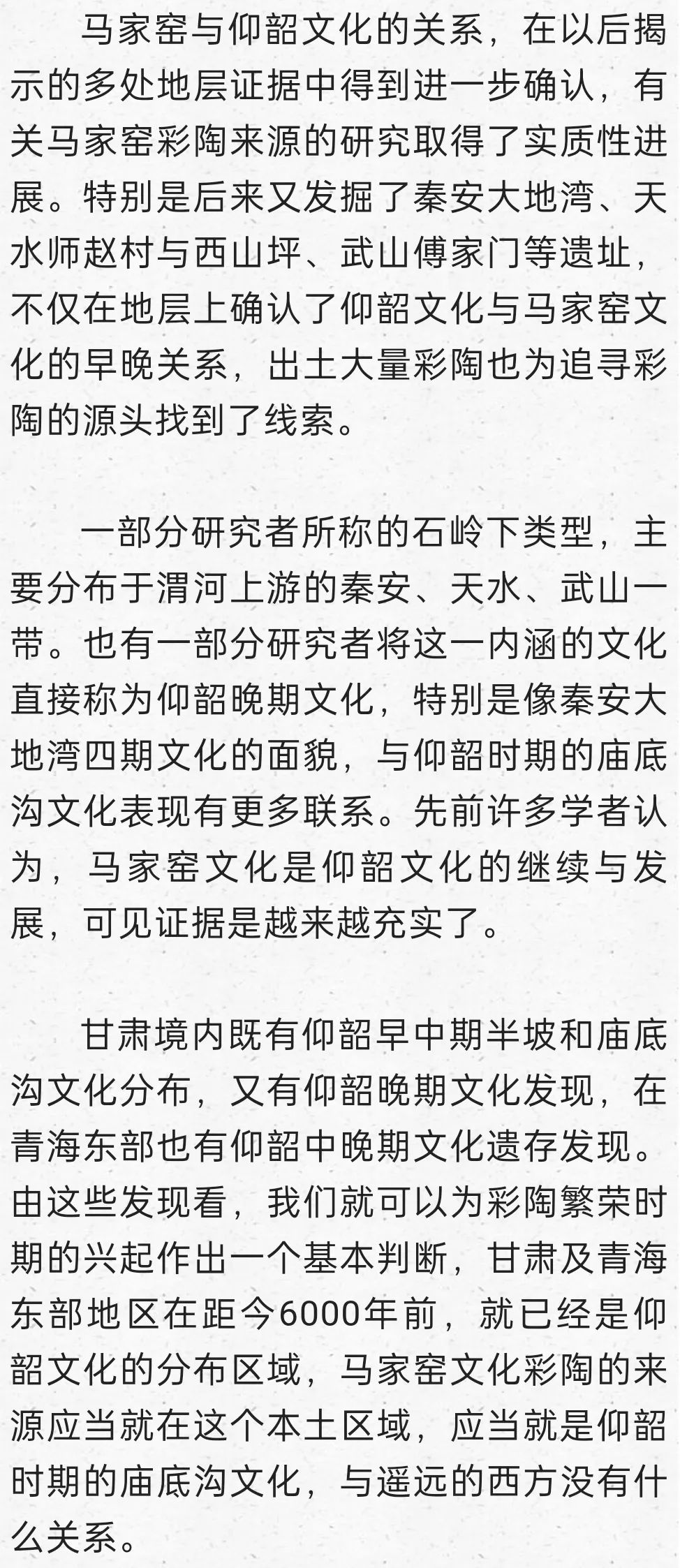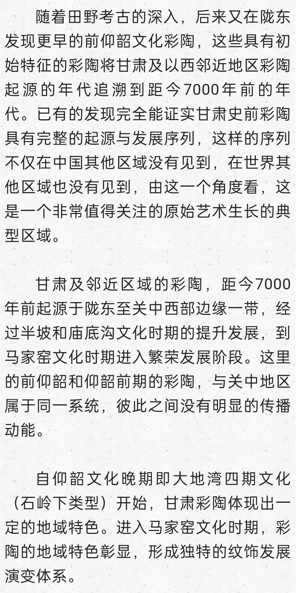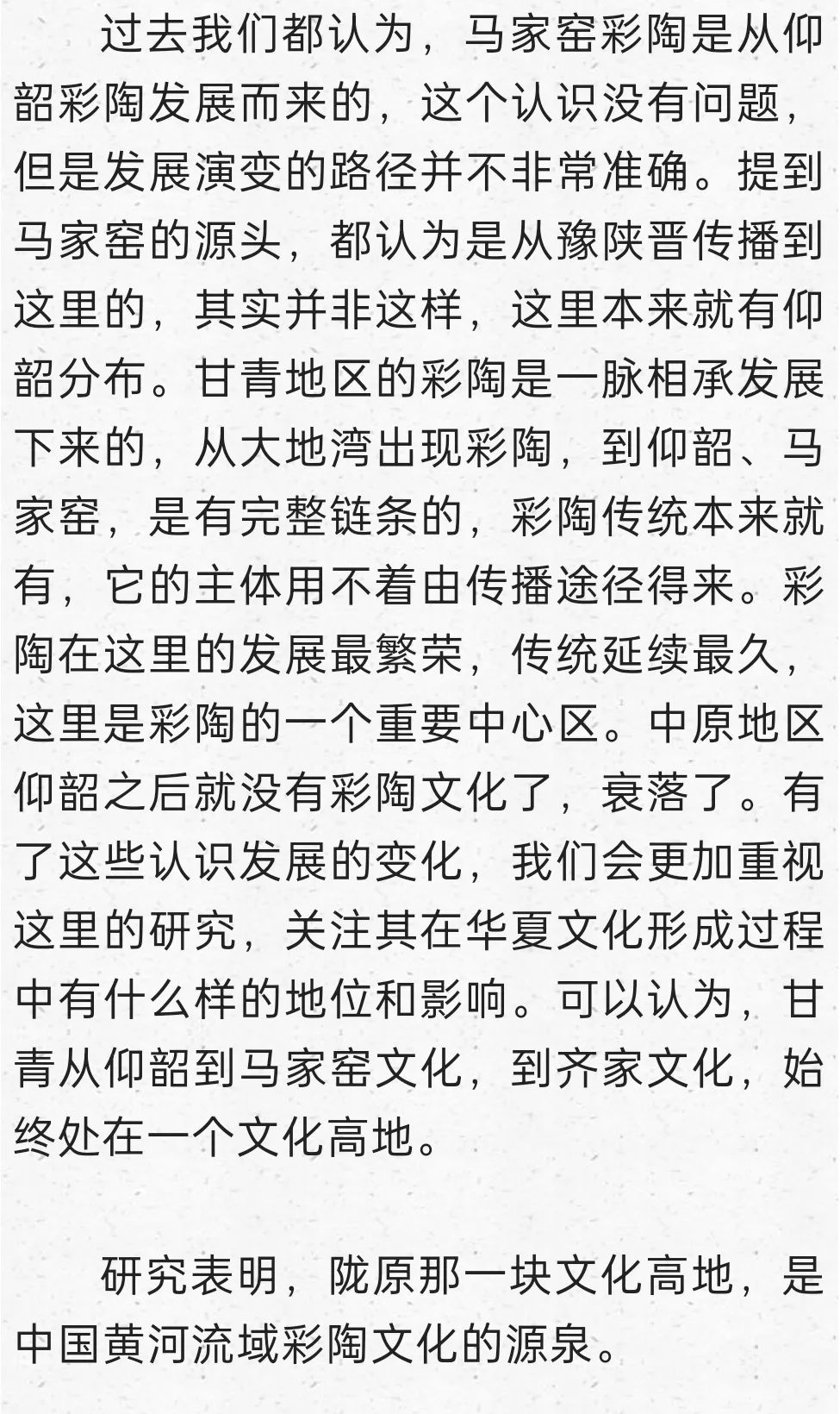 在這里明確提出到甘青尋找仰韶文化的正源,后來我又寫成《秦安大地灣遺址彩陶研究》,討論甘青彩陶的序列,也表達了類似觀點:“甘肅及青海東部地區(qū)在距今6000年前左右,就已經(jīng)是仰韶文化的分布區(qū)域,馬家窯文化彩陶的來源應(yīng)當就在這個本土區(qū)域,應(yīng)當就是仰韶時期的廟底溝文化。從文化的分布與地層堆積關(guān)系找到了甘肅地區(qū)考古學(xué)文化明確的傳承關(guān)系,由彩陶紋飾演變的考察也能尋找到傳承的脈絡(luò)”。