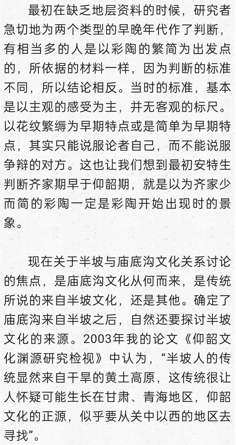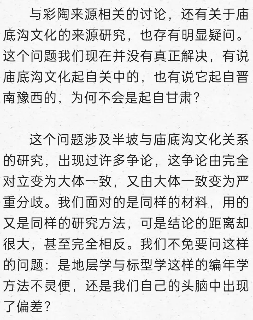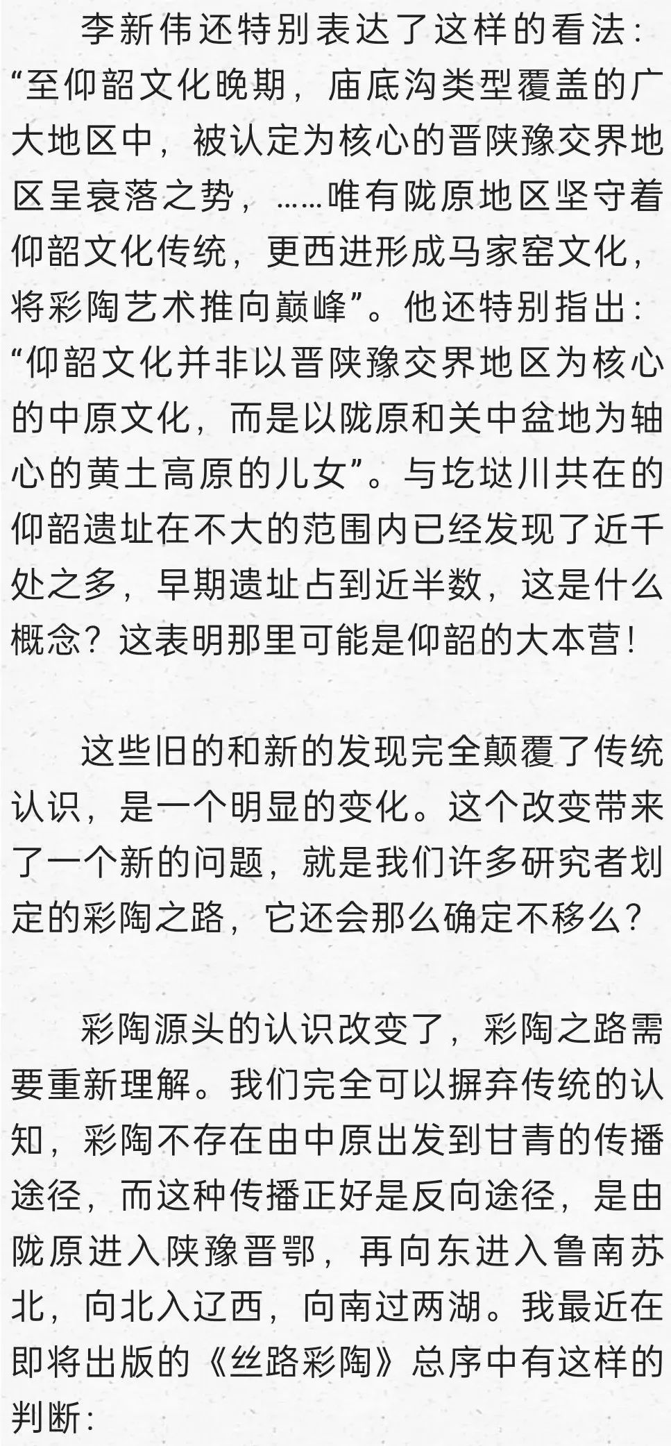 在這里明確提出到甘青尋找仰韶文化的正源,后來我又寫成《秦安大地灣遺址彩陶研究》,討論甘青彩陶的序列,也表達了類似觀點:“甘肅及青海東部地區(qū)在距今6000年前左右,就已經(jīng)是仰韶文化的分布區(qū)域,馬家窯文化彩陶的來源應(yīng)當就在這個本土區(qū)域,應(yīng)當就是仰韶時期的廟底溝文化。從文化的分布與地層堆積關(guān)系找到了甘肅地區(qū)考古學(xué)文化明確的傳承關(guān)系,由彩陶紋飾演變的考察也能尋找到傳承的脈絡(luò)”。