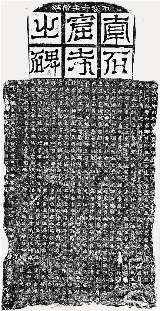 “南石窟寺之碑”原存涇川縣王家溝村南石窟寺。1912年間,當(dāng)?shù)卣畬⑵湟浦每h文廟予以陳列保護,現(xiàn)存涇川縣王母宮石窟寺文管所。碑通高225厘米,寬105厘米,厚17厘米,題額為“符文式”篆書陽刻“南石窟寺之碑”,額上橫列楷書云:“石窟寺主僧斌”。碑文楷書23行,行38字,因碑下部有斷缺,現(xiàn)每行最多存34字。碑文記載了奚康生創(chuàng)建南石窟寺的功德,碑陰有出資修建石窟的施主題名,共3列,計56人。