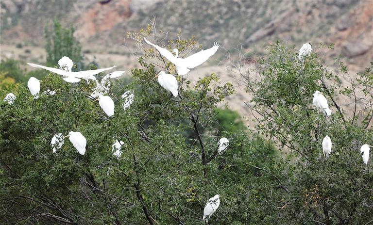 中國甘肅網10月14日訊 據蘭州日報報道 金秋十月,蘭州新區(qū)秦王川國家濕地公園秋意漸濃。近日,隨著近百只白鷺的光臨,秦王川國家濕地公園再次迎來了候鳥遷徙的高峰期,成群的白鷺憩息在樹枝,繪就了一幅亮麗的秋景圖。