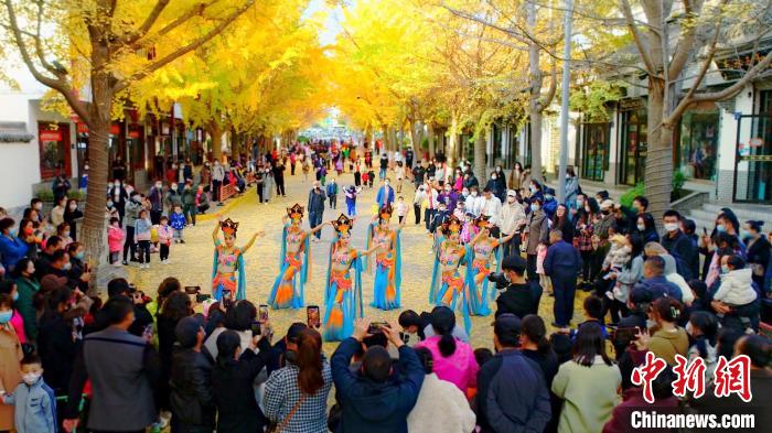 11月中下旬,在甘肅省天水市秦州區(qū)“黃金大道”上演了“絲路舞姿”,舞蹈是由秦州區(qū)文旅局組織的舞蹈隊帶來的舞蹈《絲路》《醉太平》和《萬疆》等。該路段由于216株銀杏樹的金黃色樹葉彼此參差相連,宛如兩條“黃金色帶”在道路兩側(cè),所以被當(dāng)?shù)鼐用穹Q為“黃金大道”。