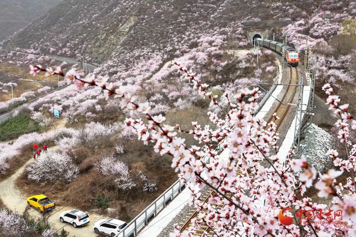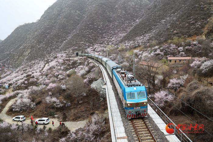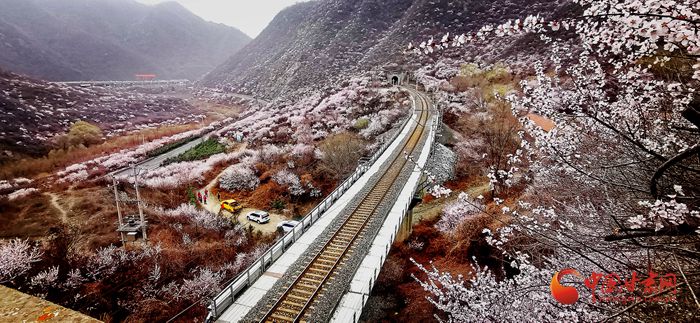 陽春三月,桃之夭夭。在崇信縣的漫山遍野上,朵朵桃花迎來盛放期。微風(fēng)吹來,暗香浮動。近看,朵朵嬌俏的桃花層層疊疊,錯(cuò)落有致。遠(yuǎn)看,漫山紅遍如霞似錦,爛漫壯觀。特別是一列列火車穿行而過,與桃花撞了個(gè)滿懷,奔向充滿希望的春天。
