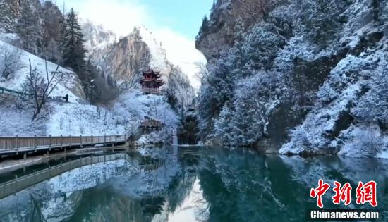 航拍甘南大峪溝雪景,銀裝素裹美如畫。(卓尼縣融媒體中心 供圖