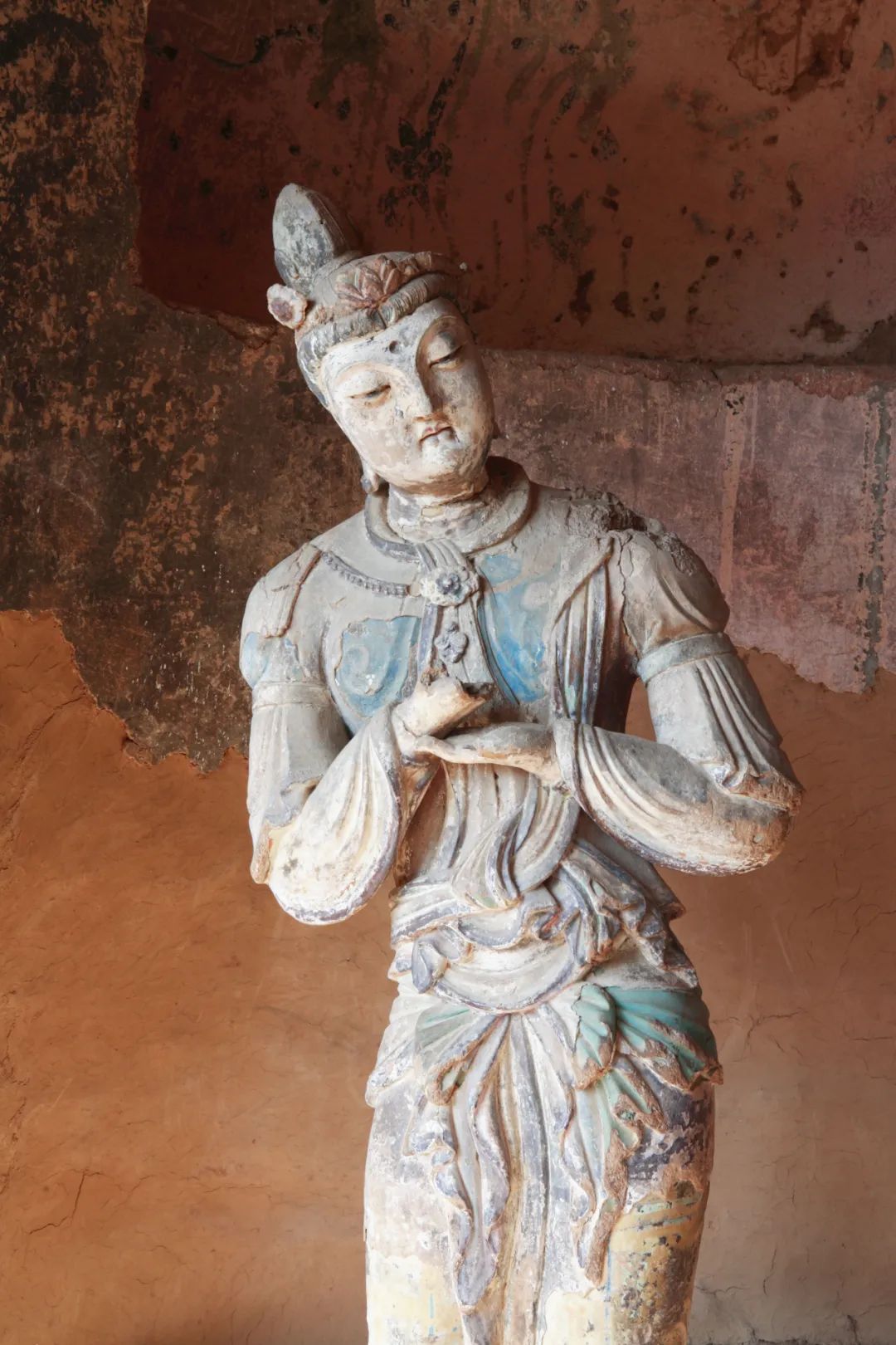 這一時期造像最杰出的代表是隋代開鑿的東崖大佛(第13窟),為石胎泥塑,正中主尊系阿彌陀佛,左、右分別為觀世音和大勢至菩薩,大佛高15.7米,氣勢宏偉,也是麥積山第一大佛。造像風(fēng)格上,體態(tài)豐腴,神情雍容大度,服飾繁縟華貴,充分展現(xiàn)出隋唐王朝的盛世風(fēng)貌。但由于地震、戰(zhàn)亂等自然和人為因素影響,盛唐以后的麥積山走向了衰敗。