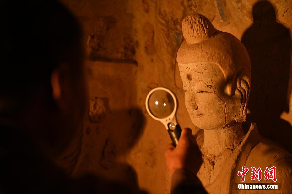 有時候看似簡單的佛像修復會遇到各類不同的文物病害,修復時間會長達三年之久,他也見證了文物修復技藝的變遷。隨著科技進步文物修復手段也變得越來越先進,他認為未來的文物保護工作一定會越來越好,年輕文保工作者們也一定會想盡更多辦法留住這座世界文化遺產。圖為8月25日,文物修復師牟常有正在仔細觀察佛像表面出現(xiàn)的病害問題。李亞龍 攝
