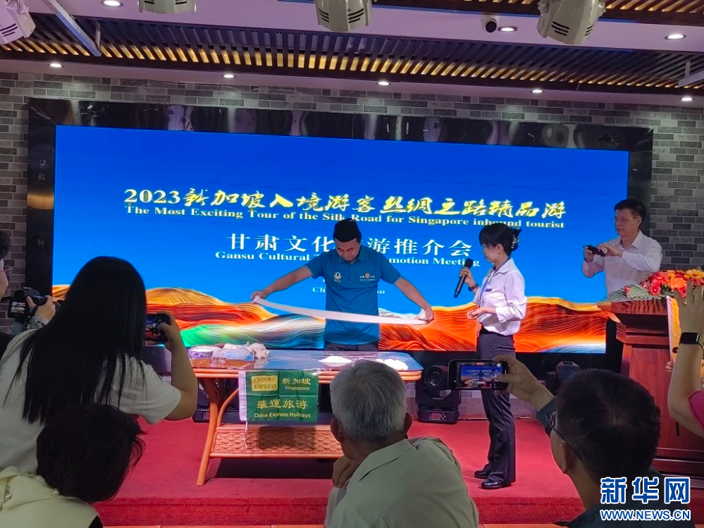 推介會(huì)上,甘肅文化和旅游推介大使向新加坡游客詳細(xì)介紹了甘肅多元且極富特色的文化旅游資源;蘭州拉面師傅為大家現(xiàn)場(chǎng)表演了非遺美食牛肉面的拉面絕技;新加坡南方藝術(shù)研究會(huì)合唱團(tuán)還進(jìn)行了合唱表演。