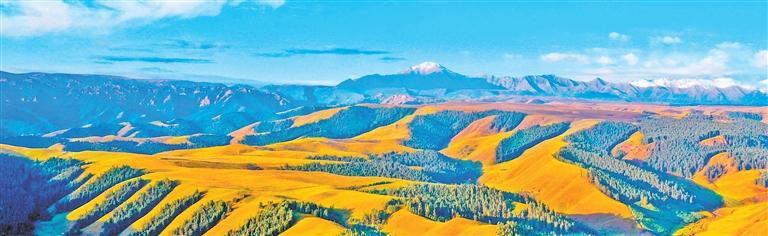 初冬的祁連山,顯示出獨特韻味。主峰在藍(lán)天白云的映襯下顯得肅穆大氣。周圍群峰羅列、層巒疊嶂,高低延綿的山脈在陽光的照耀下交相輝映,近處的群山被此起彼伏的林海包圍,像一道道美麗的波浪。祁連山脈山高、天藍(lán),大自然賜予這片土地最原始的靈秀與遼闊。