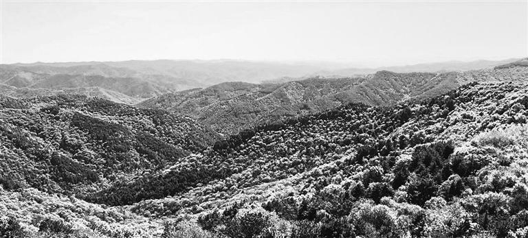 離開黃帝陵園,沿省道繼續(xù)行進,逐漸進入了高原林海。四面山川勾連,丘谷交織,全被森林覆蓋。無數(shù)高峻的山嶺如群龍盤繞,道道山脊線條分明,錯落有致,茂密的林木在冬寒中襯成一派青藍底色,常綠的松柏又在林海中開拓出成片蒼翠。極目遠望,在正午的陽光照耀下,林海風煙彌漫,顯出一種天地間的浩然之氣。