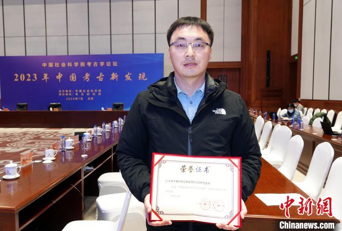 1月30日,2023年中國考古新發(fā)現(xiàn)在北京揭曉發(fā)布,肯尼亞共和國博高利亞湖舊石器時代遺址入選中國2023年國外考古新發(fā)現(xiàn),趙清坡代表項(xiàng)目領(lǐng)取榮譽(yù)證書在會場留影。中新網(wǎng)記者 孫自法 攝