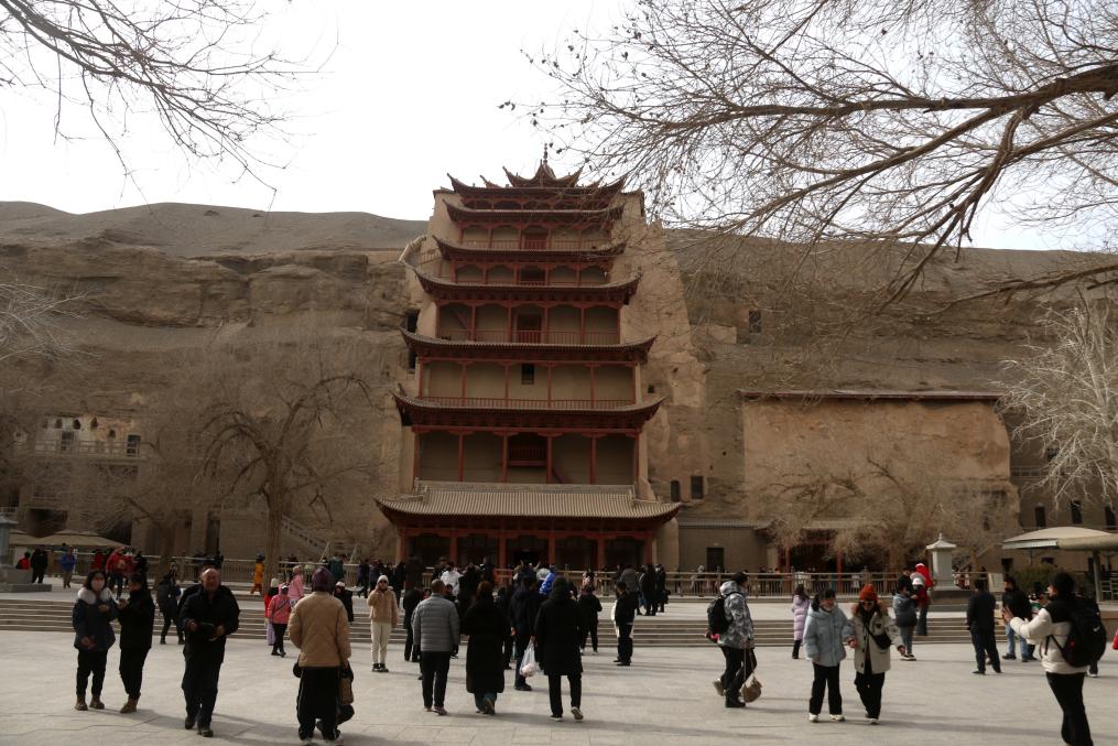 2024年2月13日,游客在世界文化遺產(chǎn)敦煌莫高窟參觀。