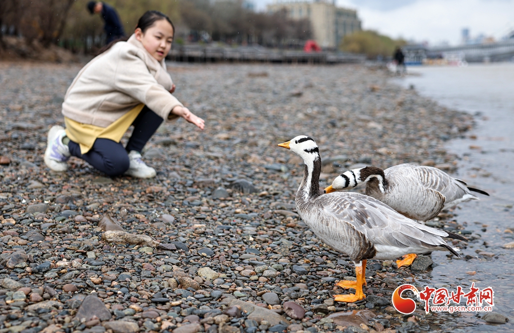 當(dāng)日,在蘭州市城關(guān)區(qū)黃河河畔,一對斑頭雁與市民溫馨相遇,吸引不少市民駐足投喂,拍照“打卡”。