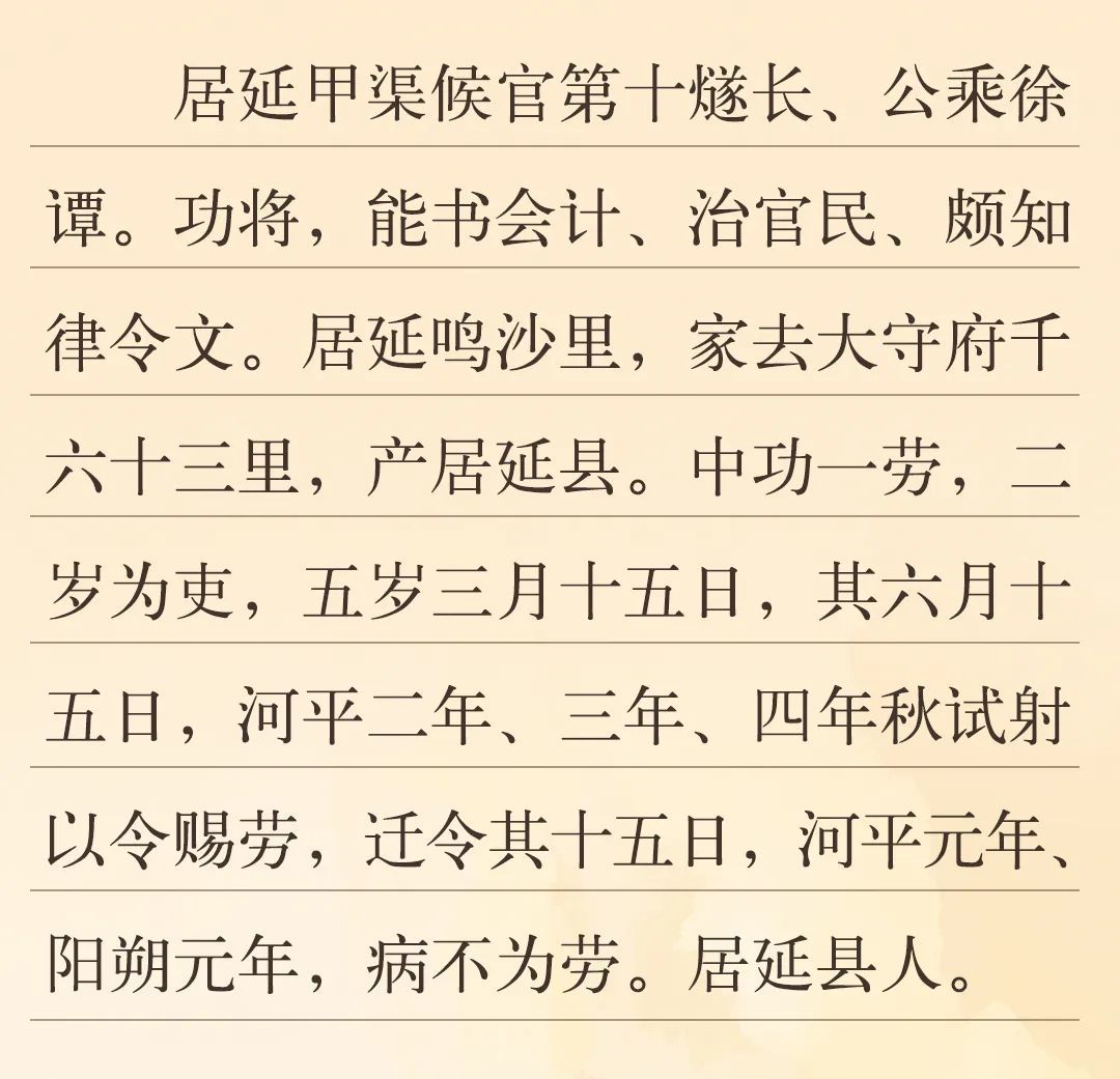 “中功一勞”中的“中功”指得到的功。功、勞、功勞、功績,是漢代計(jì)算政績的名稱與單位,戍卒與官員每日巡視、抵御外敵、參與秋射等,都能積攢“功”、“勞”。簡文中提到了“河平二年、三年、四年秋試射以令賜勞”,“秋試射”即漢代秋季比武活動(dòng)之一的秋射。秋射成績優(yōu)秀可以賞賜勞績,漢代邊塞地區(qū)出土的簡牘中有大量以秋射獲勞的記錄,“功”與“勞”積攢到一定程度,便可升遷。當(dāng)這位官員所屬的候官發(fā)現(xiàn)空缺,便以功勞案為依據(jù),給出官員任免方案,呈報(bào)都尉府,以進(jìn)行官員的升遷調(diào)動(dòng)。