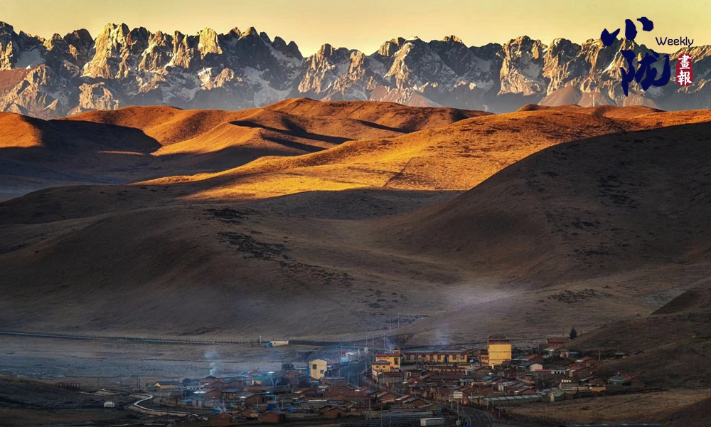 遠(yuǎn)處連綿的群山白雪皚皚,山下青黃的草甸、安靜的藏式小村、飄蕩的經(jīng)幡、裊裊炊煙,勾勒出一幅美麗的畫。