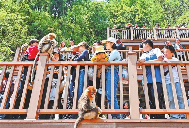 游客在隴南市武都區(qū)裕河鎮(zhèn)與川金絲猴親密接觸。新甘肅·甘肅日?qǐng)?bào)記者 丁凱