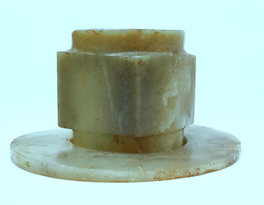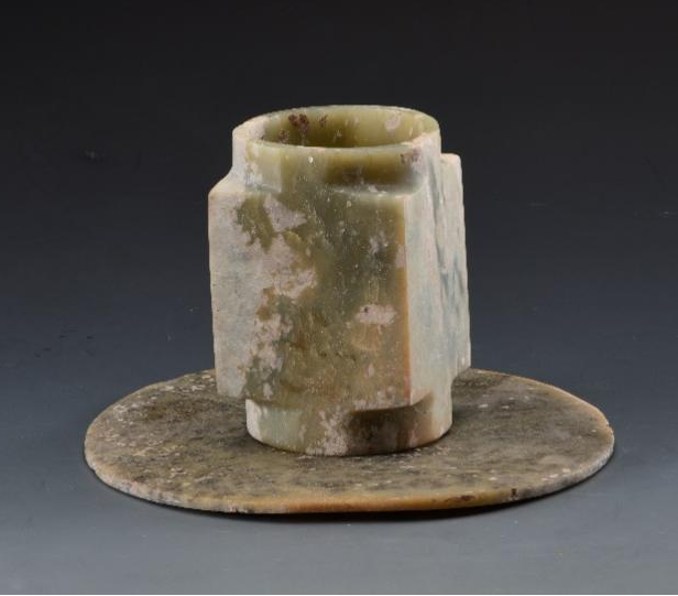 胡家底遺址發(fā)現(xiàn)的三對玉璧和玉琮,每對材質(zhì)基本相同,玉璧中孔可套疊在琮之射端,可見當(dāng)年有可能套疊使用以祭祀天地。
