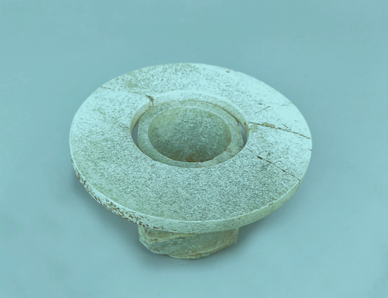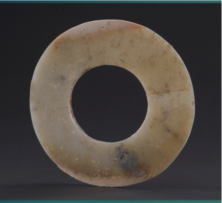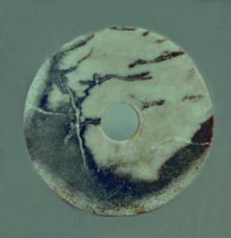 玉璧(編號總0129:5)直經(jīng)9厘米,單面鉆孔,大端孔徑4.4厘米,小端孔徑4厘米,厚度0.55—0.7厘米,璧外緣有磕碰痕。