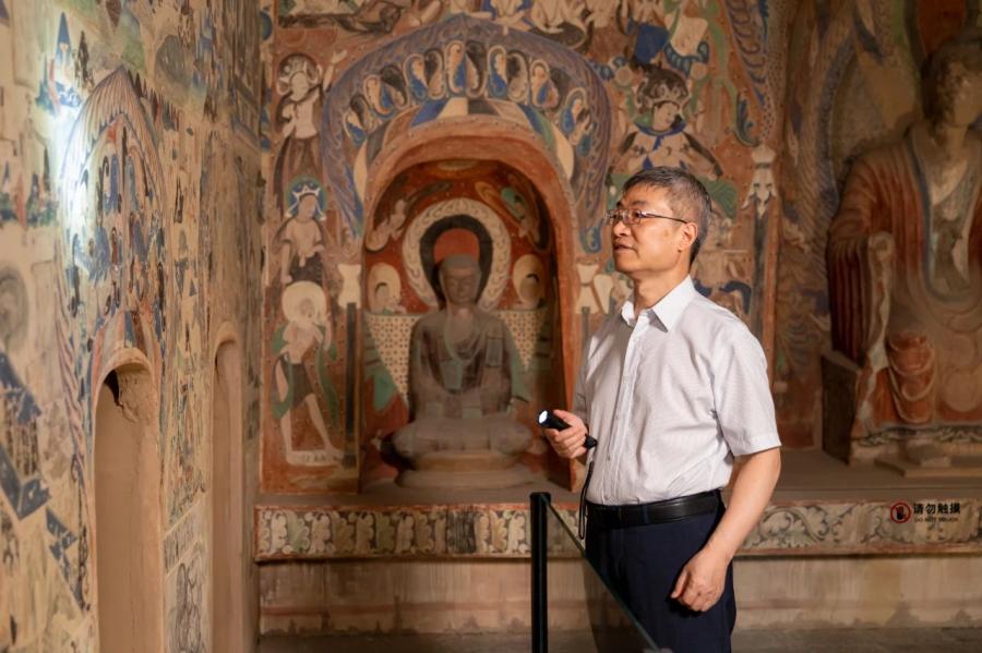 趙聲良在莫高窟第285窟(復(fù)制窟)中做學(xué)術(shù)考察。敦煌研究院 供圖