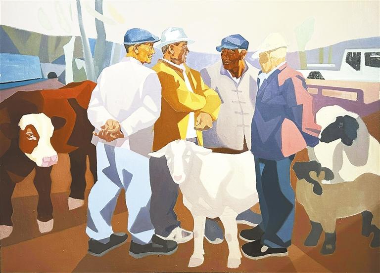 《和風》系列作品取材于禮縣鹽官鎮(zhèn)騾馬市場逢集時交易的場景。幼時,我經(jīng)常隨父親去鹽官騾馬市場趕集,對這個場景熟悉且親切。也正因為如此,我對這個題材有著難以割舍的情愫,總是忍不住想通過畫筆呈現(xiàn)這一記憶。