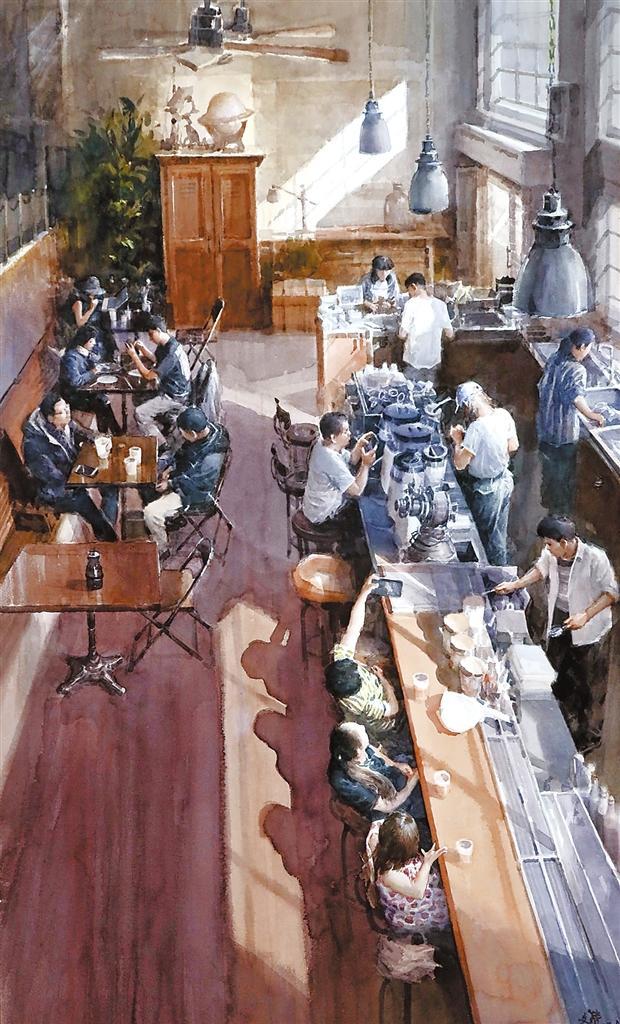 《網(wǎng)紅咖啡館的午后》用寫實方法展現(xiàn)了一個溫馨的生活場景。在構(gòu)圖上,以俯視的角度用大場景來做整體畫面的籌劃,在整體色調(diào)上以沉穩(wěn)厚重的暖色作為基調(diào),把光線穿插、引入到畫面中。在布局上,以陽光照耀下的咖啡館吧臺為主要表現(xiàn)組群,分別刻畫、塑造了工作中的前臺人員、打卡拍照的女性顧客群;把暗部區(qū)域,幾組在咖啡桌邊交談、用餐、喝咖啡的顧客群作為第二層次,展現(xiàn)他們不同的神情和體態(tài);然后完善整體的空間感。在用筆上盡量以松動的筆觸,又能展現(xiàn)細節(jié)的方式來塑造,利用水彩畫需要干、濕、松、緊相結(jié)合,多層次、多遍數(shù)進行渲染的特性,盡可能達到預(yù)期效果。 (本版文圖由甘肅省美術(shù)家協(xié)會提供)