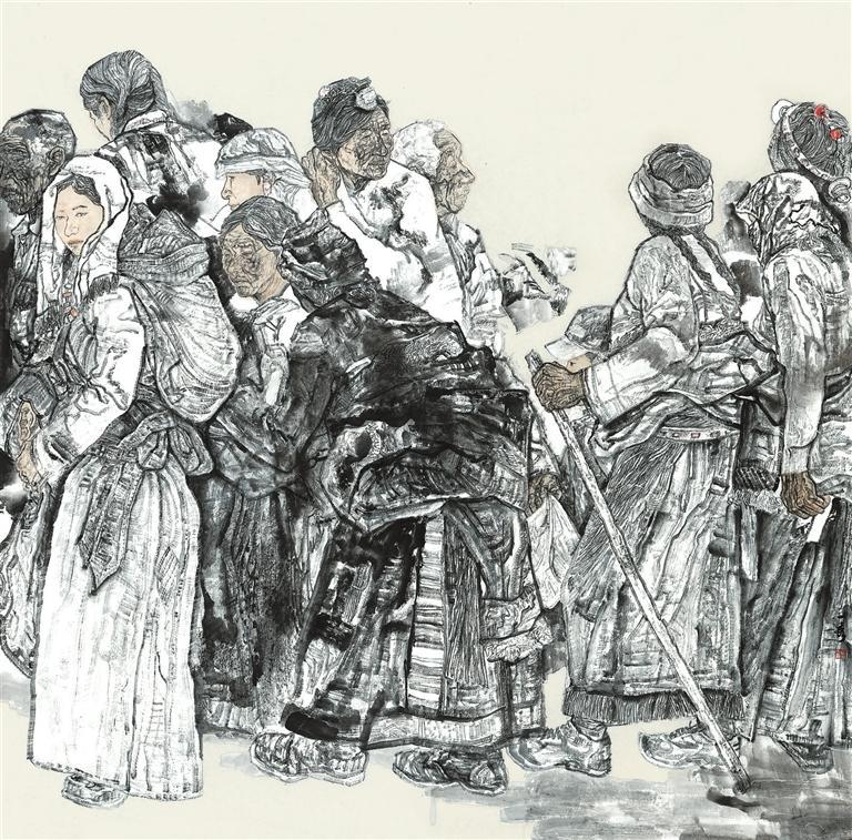 作品《趕集》主要描繪了不同年齡階段的人物聚集一起趕集的一幕,以筆墨求真的態(tài)度,通過(guò)不同的形象去表現(xiàn)人物的真善美。在落墨前,我對(duì)人物造型和畫(huà)面形式結(jié)構(gòu)反復(fù)推敲打磨,力求作品更有溫度和厚度。