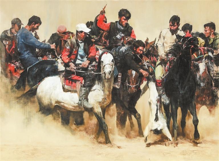 非遺——塔吉克叼羊 (油畫(huà)) 張國(guó)鋒 (本版文圖由甘肅省美術(shù)家協(xié)會(huì)提供)