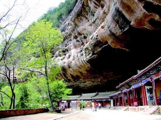 那天,自然之神行走于隴山渭水間,他雙手揮動,如雕如塑,將山川大地刻畫得瑰麗而神奇。當他完成麥積山的杰作后,輕輕一拂指尖,卻不小心將一座砂崖的底部抹去,使之形成一面巨大的石檐。這石檐下,形狀恰似蛤蟆之嘴,能藏千軍萬馬,充滿了神秘與威嚴。