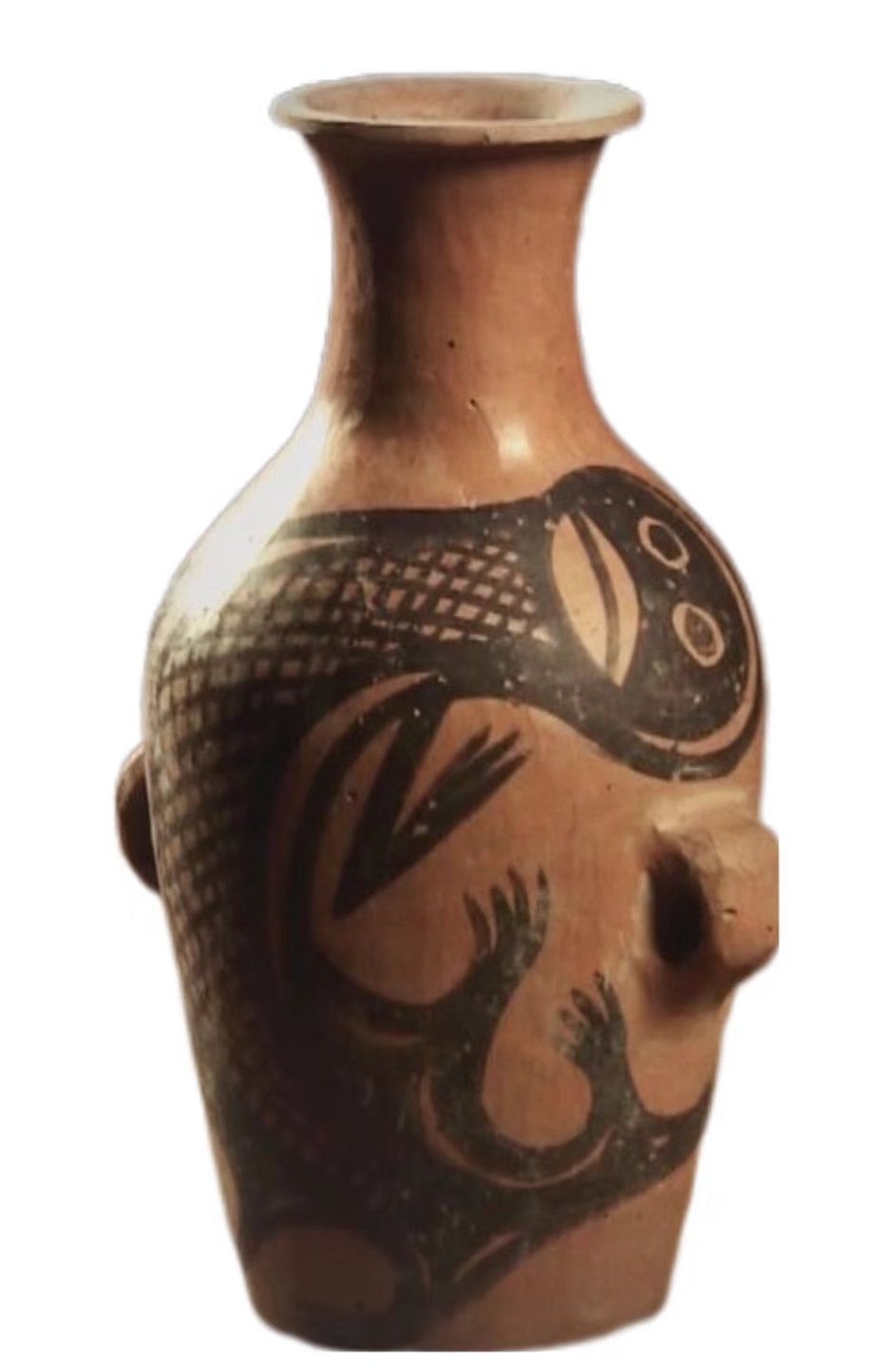 這件鯢魚紋彩陶瓶為泥質(zhì)紅陶,高18.5厘米,口徑寬5.7厘米,底徑7厘米,腹徑14厘米,重430克。陶瓶最顯著的特征是在腹部繪有動(dòng)物圖紋。動(dòng)物的身子呈蜷曲狀,尾巴向上翹舉,交于頭上。臉?biāo)迫嗣妫p眼圓睜而有神。嘴巴寬闊,顎下有須,頭頂兩側(cè)有伸出的節(jié)肢狀腮。奇怪的是,它只有一對(duì)前肢,肢端有張開(kāi)的四肢。陶瓶身上繪制有網(wǎng)格狀的線紋。線條流利而生動(dòng),變化豐富,展現(xiàn)出了熟練自如的繪畫技巧。從鯢魚圖案的繪制來(lái)看,紋飾用筆鋒畫作的線條遒勁有力,頓挫有致。粗細(xì)不同的線條之間,還凸顯出了圖紋部位的主次。彩陶的出現(xiàn),也似乎在見(jiàn)證著先祖?zhèn)冊(cè)谑庝离x居、不常厥邑的歲月中所經(jīng)歷的那些艱難生活。