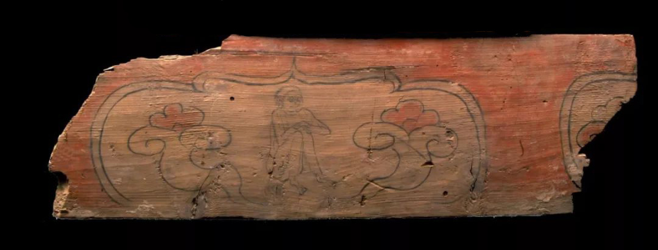 彩繪“猴”生肖木版畫(huà),唐代,一級(jí)文物。1979年肅南縣大長(zhǎng)嶺唐墓出土。木版畫(huà)長(zhǎng)73厘米,寬22厘米,猴生肖木版畫(huà)呈長(zhǎng)方形,墨筆雙線勾勒一壸門開(kāi)光。壸門內(nèi)墨線勾勒一猴,其雙手環(huán)抱膝蓋至胸前,猴身兩側(cè)繪有兩朵升騰祥云。壸門外飾以土紅色。