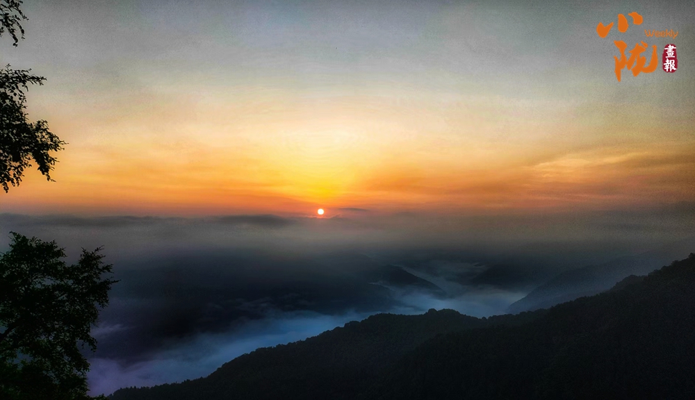 云開霧散、日照山澗,在夕陽映照下彌漫開來的云霧像涂上了一層金黃色,大地、山川顯得格外瑰麗。