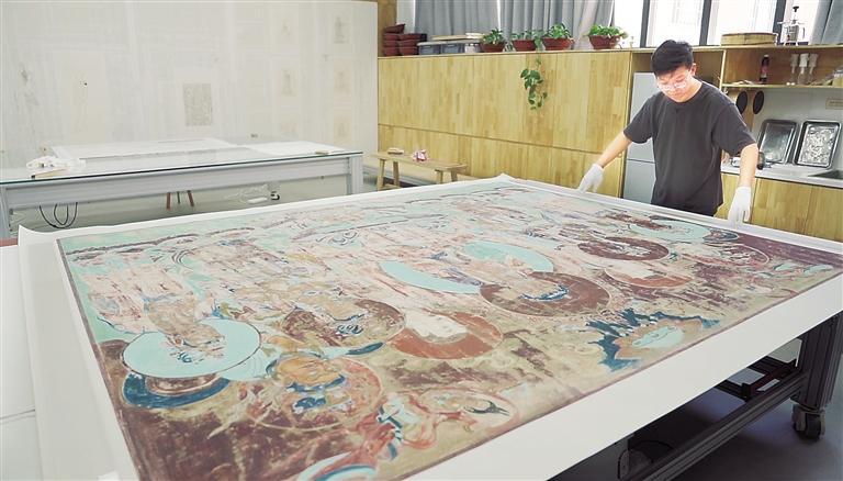 將畫(huà)作噴濕、刷上糨糊、覆上紙、刷平、上墻全色……7年里,徐喆在周而復(fù)始的工序里與作者對(duì)話(huà),在時(shí)間的長(zhǎng)河里,感受歷史的厚重和精彩。