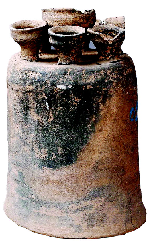 寺洼文化灰陶聯(lián)盞,通身為泥質(zhì)灰陶,主體呈一倒扣的鐘形,在鐘形體的頂端粘連著七個(gè)豆?fàn)畋K杯。其中中間一個(gè)稍大略高,其他六個(gè)稍小一些,等距分布在中央一個(gè)的周圍,呈眾星拱月之狀。