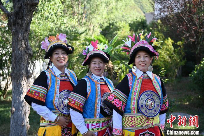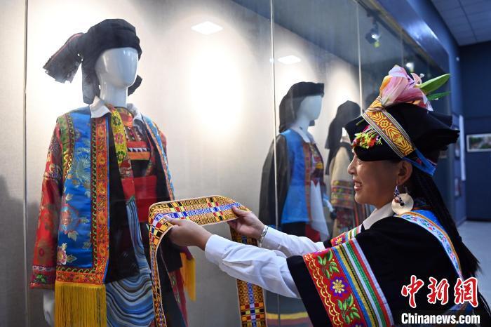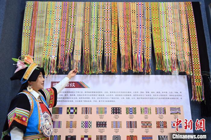 9月26日,甘肅省甘南藏族自治州舟曲縣,當?shù)夭刈鍕D女展示錦帶佩戴方式。錦帶是舟曲藏族婦女用以束腰、扎靴、攏發(fā)乃至點綴服飾的花帶子,艷麗多彩、圖案優(yōu)美。每逢吉慶節(jié)日,藏族婦女穿戴的華麗盛裝就需要少則五、六條,多則十幾條寬窄長短相宜的錦帶來裝飾。據(jù)介紹,藏族織錦帶技藝歷史悠久,一千多年以前,古羌族和吐蕃已有了較發(fā)達的手工編織技術(shù),在艱難的生活條件下對服飾等生活用品除實用功能之外,已經(jīng)有了強烈的審美追求,是研究舟曲羌藏文化的“活化石”。中新社記者 九美旦增 攝