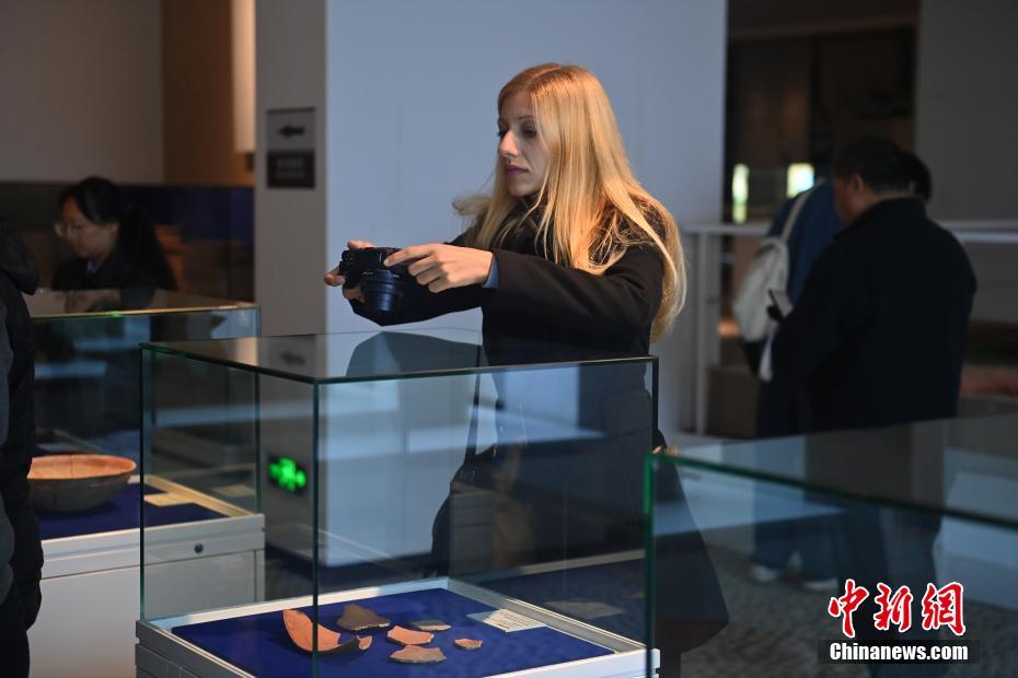 10月22日,2024青年漢學(xué)家研修計(jì)劃甘肅班團(tuán)隊(duì)22個(gè)國(guó)家的青年漢學(xué)家,走進(jìn)甘肅省天水市秦安縣大地灣遺址參觀并進(jìn)行專(zhuān)題研修。大地灣遺址是新石器時(shí)代大型聚落遺址,出土了中國(guó)乃至世界上最早的彩陶文化、最早的文字符號(hào)、種植生產(chǎn)了中國(guó)第一批糧食品種黍、出現(xiàn)了最早的宮殿式建筑、發(fā)明了世界最早的水泥地面、創(chuàng)造了最早的繪畫(huà)作品——F411地畫(huà)。圖為國(guó)外青年漢學(xué)家拍攝大地灣博物館藏品。中新社記者 李亞龍 攝