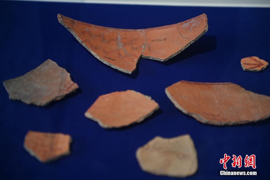 10月22日,2024青年漢學(xué)家研修計(jì)劃甘肅班團(tuán)隊(duì)22個(gè)國(guó)家的青年漢學(xué)家,走進(jìn)甘肅省天水市秦安縣大地灣遺址參觀并進(jìn)行專(zhuān)題研修。大地灣遺址是新石器時(shí)代大型聚落遺址,出土了中國(guó)乃至世界上最早的彩陶文化、最早的文字符號(hào)、種植生產(chǎn)了中國(guó)第一批糧食品種黍、出現(xiàn)了最早的宮殿式建筑、發(fā)明了世界最早的水泥地面、創(chuàng)造了最早的繪畫(huà)作品——F411地畫(huà)。圖為大地灣博物館展品最早的文字符號(hào)彩繪符號(hào)陶片。中新社記者 李亞龍 攝