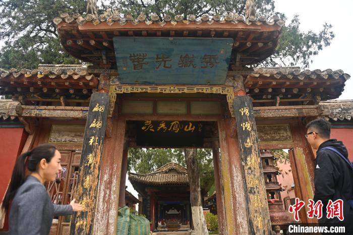 10月23日,甘肅省天水市秦安縣鳳山景區(qū),游人參觀蘇淵雷所題“秀岳先春”的匾額。中新社記者 李亞龍 攝
