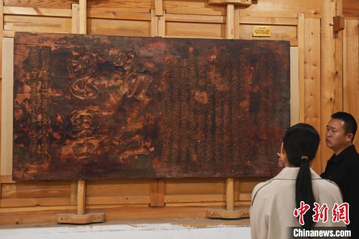 10月23日,甘肅省天水市秦安縣明清街秦安匾額博物館,游人參觀歷史名人胡纘宗所題《世代昌隆》的匾額。中新社記者 李亞龍 攝