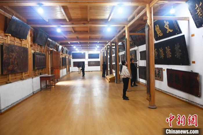 10月23日,甘肅省天水市秦安縣明清街秦安匾額博物館,游人參觀當(dāng)?shù)厥詹氐呢翌~。中新社記者 李亞龍 攝