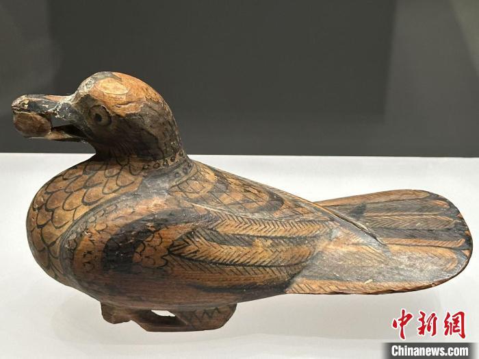 圖為正在展陳的彩繪漆木鳩。 戴文昌 攝