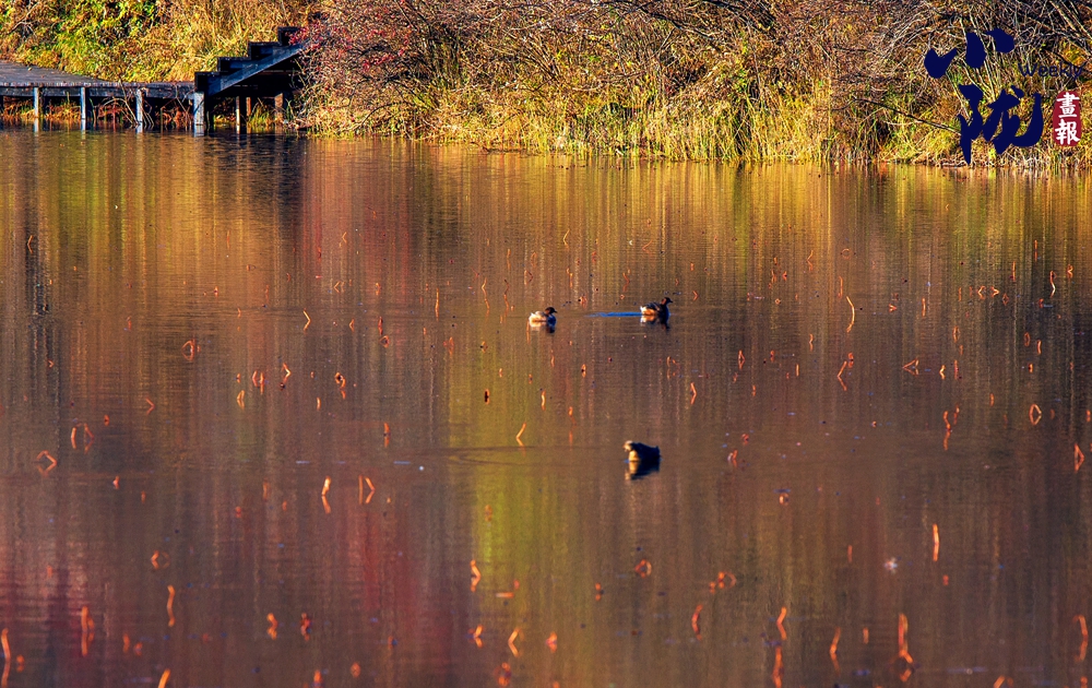 湫水深不可測(cè),湫池依偎在深林密樹旁邊,湫面蕩起縷縷波紋,浮光泛金,一群悠閑的野鴨在水面上游來游去?!?/p>