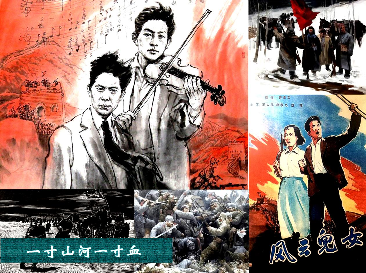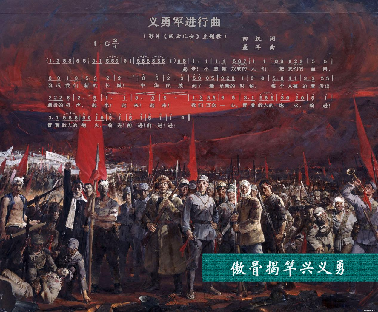 ⑤一曲狂飆:指《義勇軍進行曲》?!?a >義勇軍進行曲》面世后,立即成為廣泛流傳的抗戰(zhàn)歌曲。世界反法西斯戰(zhàn)爭即將結束之際,該曲被選入反法西斯盟軍勝利凱旋的曲目。戰(zhàn)爭結束后,同盟國集會時,《義勇軍進行曲》作為代表中國的歌曲演奏。美國還將該曲與美國的《美麗的美利堅》、法國的《馬賽曲》等歌曲定為同盟國勝利之日的音樂節(jié)目廣播歌曲。1949年9月27日,中華人民共和國人民政治協(xié)商會議第一屆全體會議通過決議,《義勇軍進行曲》為代國歌。1982年12月,中華人民共和國第五屆全國人民代表大會第五次全體會議確定《義勇軍進行曲》為中華人民共和國國歌。2004年3月14日,中華人民共和國第十屆全國人大二次會議通過的憲法修正案規(guī)定“中華人民共和國國歌是《義勇軍進行曲》”?!读x勇軍進行曲》作為國歌,正式被寫入中華人民共和國憲法。