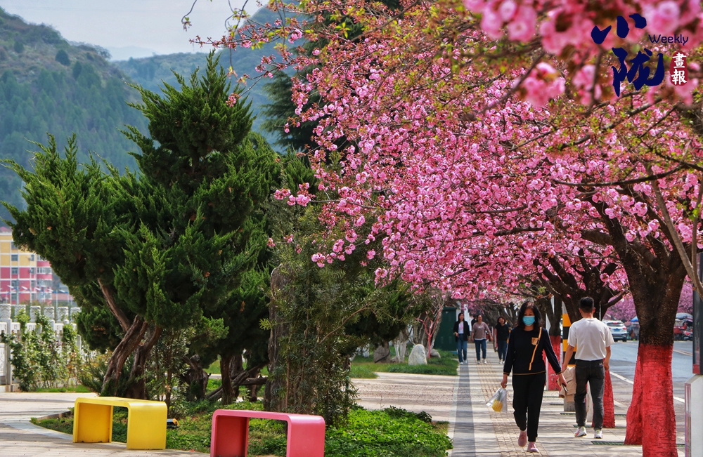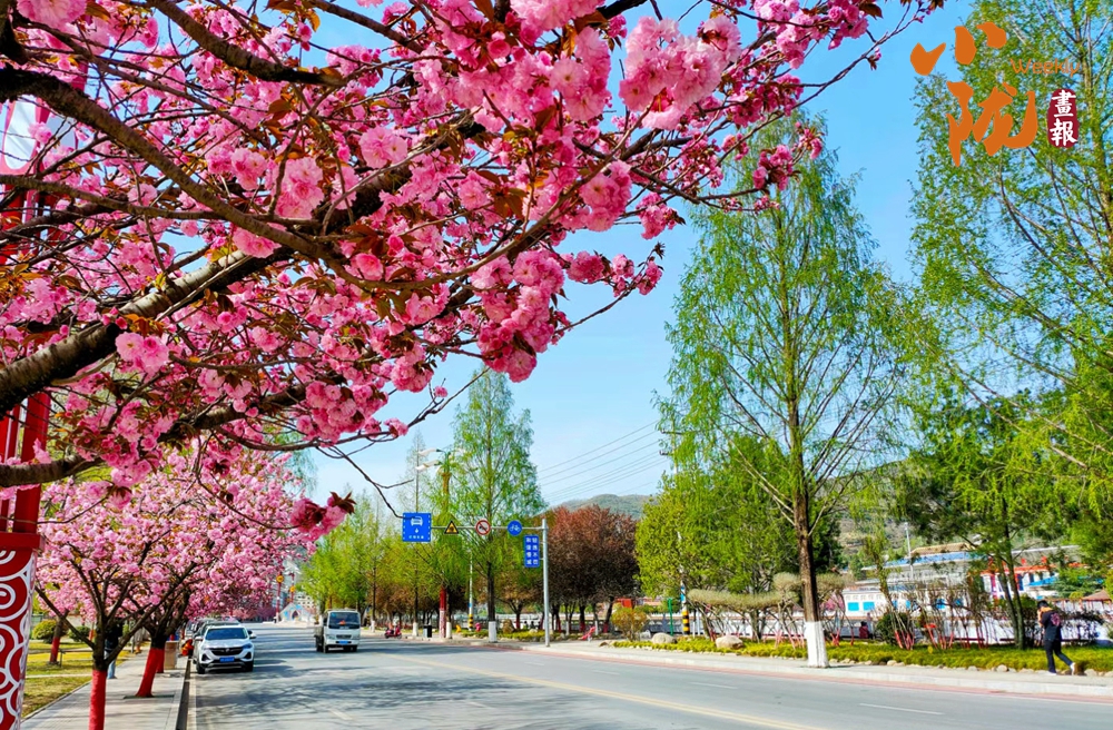 街道兩旁紅綠相映,濕潤的空氣中飄散著櫻花的淡淡芬芳,藍天澄澈如洗,青山如黛,綠水潺潺,形成“一街一景”的綠化格局,為市民打造了觸手可及的“詩與遠方”。