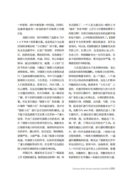 回到蘭州后,我仔細(xì)拜讀了這部85萬(wàn)字(上下兩冊(cè))的厚重論著。這是我迄今為止閱讀到的首部縣級(jí)“文化概論”的專(zhuān)著。佩彰先生在這部書(shū)中,以寬廣的視野,豐厚的學(xué)識(shí),獨(dú)到的見(jiàn)地,縝密的歸納,系統(tǒng)闡述了鎮(zhèn)原文化的淵源、內(nèi)涵、特征、核心和基本精神,通過(guò)對(duì)鎮(zhèn)原歷史、地理、人文的廣泛探尋和深入挖掘,勾勒出了鎮(zhèn)原文化演變的清晰脈絡(luò)。同時(shí),對(duì)鎮(zhèn)原文化的主要載體進(jìn)行了全新梳理和創(chuàng)新研究。書(shū)中不僅涵蓋了鎮(zhèn)原的文化狀況、文化形態(tài)、文化特征以及人們的思想觀念、思維方式、風(fēng)俗習(xí)慣、文化心理等,而且在探幽析微中揭示出了鎮(zhèn)原文化蘊(yùn)含的特色、樣式和規(guī)律,是一部系統(tǒng)了解、學(xué)習(xí)和研究鎮(zhèn)原文化的學(xué)術(shù)性理論專(zhuān)著。并且首次提出“鎮(zhèn)原文化”的命題,首次闡釋“鎮(zhèn)原文化”的內(nèi)涵及演變,首次對(duì)“鎮(zhèn)原文化”進(jìn)行全方位的歸納和解讀。這不能不說(shuō)是鎮(zhèn)原乃至甘肅文化界的一個(gè)重大創(chuàng)舉,開(kāi)啟了系統(tǒng)研究鎮(zhèn)原文化的先河,填補(bǔ)了鎮(zhèn)原文化綜合性研究的空白。佩彰先生以鎮(zhèn)原本地人特有的執(zhí)著、雄厚的積淀和務(wù)實(shí)的學(xué)風(fēng),潛心研究,恰當(dāng)定位,精準(zhǔn)概括,邏輯嚴(yán)密,文辭嚴(yán)謹(jǐn),打造了鎮(zhèn)原文化的新高地,對(duì)鎮(zhèn)原文化的傳承、弘揚(yáng)和發(fā)展起到了重大的輻射帶動(dòng)作用,在甘肅乃至全國(guó)縣級(jí)文化研究領(lǐng)域具有示范性和導(dǎo)向性。
