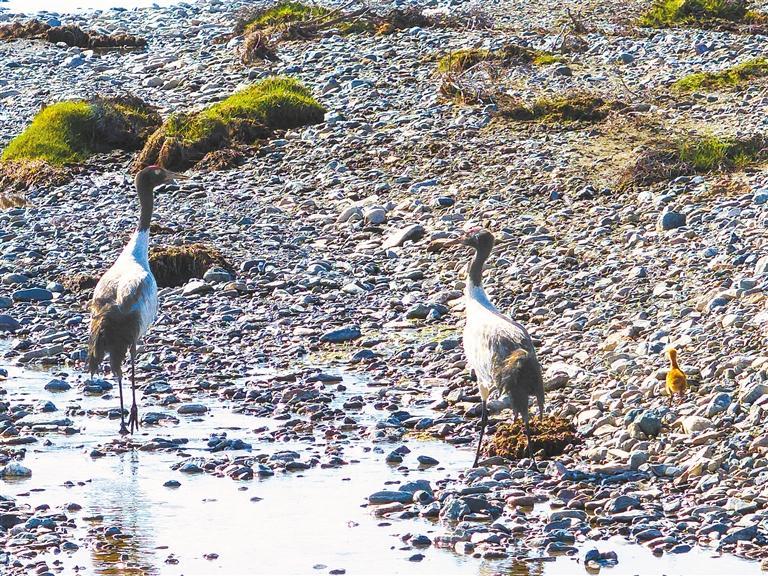 甘肅祁連山國家級自然保護區(qū)管護中心出現(xiàn)的三只黑頸鶴。新甘肅·甘肅日報通訊員 李海軍