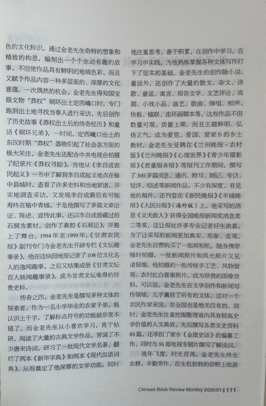 傳奇之四,金老先生是撰寫多種文體的探索者。作為一名小學畢業(yè)的農家子弟,能認識上千字,了解標點符號的功能就非常不錯了,而金老先生從小喜歡學習,肯于鉆研,閱讀了大量的古典文學作品,背誦了不少唐宋詩詞,研習了一批現代文學名著,翻爛了兩本《新華字典》和兩本《現代漢語詞典》,從而奠定了他深厚的文學功底。同時他注重思考,善于積累,在創(chuàng)作中學習,在學習中實踐,為他熟練掌握各種文體寫作打下了堅實的基礎。金老先生的創(chuàng)作除小說、童話外,還創(chuàng)作了大量的散文、雜文、詩歌、童謠、寓言、報告文學、文藝評論、戲劇、小戲小品、曲藝、歌曲、彈唱、相聲、快板、楹聯、連環(huán)畫腳本等,這些作品不但數量可觀、質量上乘,而且主題鮮明、弘揚正氣,成為愛黨、愛國、愛家鄉(xiāng)的鄉(xiāng)土教材。金老先生受聘在《蘭州晚報·農村版》《蘭州晚報》《心理世界》《青少年攝影報》《質量服務報》等報刊工作期間,撰寫了300多篇消息、通訊、特寫、側記、專訪、短評、綜述等新聞作品,不少有深度、有見地的稿件,還刊登在《新民晚報》《羊城晚報》《人民日報》(海外版)上。他采寫的消息《義犬救人》獲得全國晚報新聞獎消息類二等獎,這讓報社許多專業(yè)記者好生羨慕。為了讓采寫的新聞更加真實、形象、直觀,金老先生自費購買了一部照相機,隨身攜帶隨時拍攝,一批新聞照片和風光照片又見諸報端。他拍攝的一些傳統(tǒng)手工藝、風物景觀、農村紅白喜事照片,成為珍貴的圖像資料。可以說,金老先生在文學創(chuàng)作和新聞寫作領域,幾乎囊括了所有的文體,這對一個農民作家來說,在全國也是絕無僅有的。同時,金老先生注重挖掘整理省內具有較高史學價值的人文典故,先后撰寫各類文史資料83篇,還承擔了家鄉(xiāng)《金崖史話》的編纂工作,同時為16部電視專題片撰寫了解說詞。